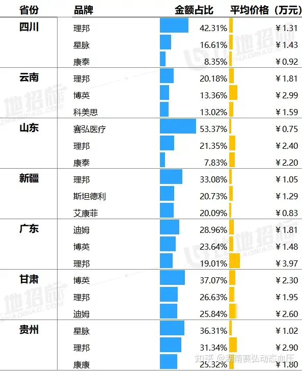 不同地区对品牌的偏好有所不同,四川偏好理邦、星脉、康泰;云南偏好理邦、博英、科美思;山东偏好赛弘医疗、理邦、康泰等。